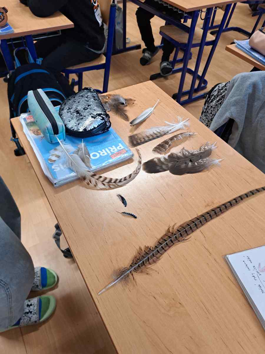 Aneta na hodině přírodopisu připravila pro žáky zajímavé povídání o ptačím peří. Žáci si peří prohlédli i pod mikroskopem a dozvěděli se mnoho zajímavostí o jeho stavbě a funkci. Aneta navštěvuje myslivecký kroužek, což jí umožňuje své znalosti sdílet i s praktickými ukázkami.