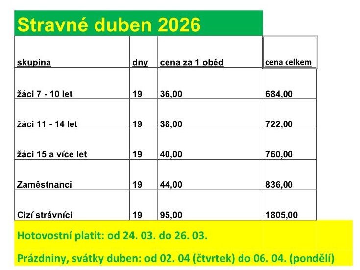 - mimořádné stravování (akce) dle rozhodnutí ředitele školy a vedoucí školní jídelny